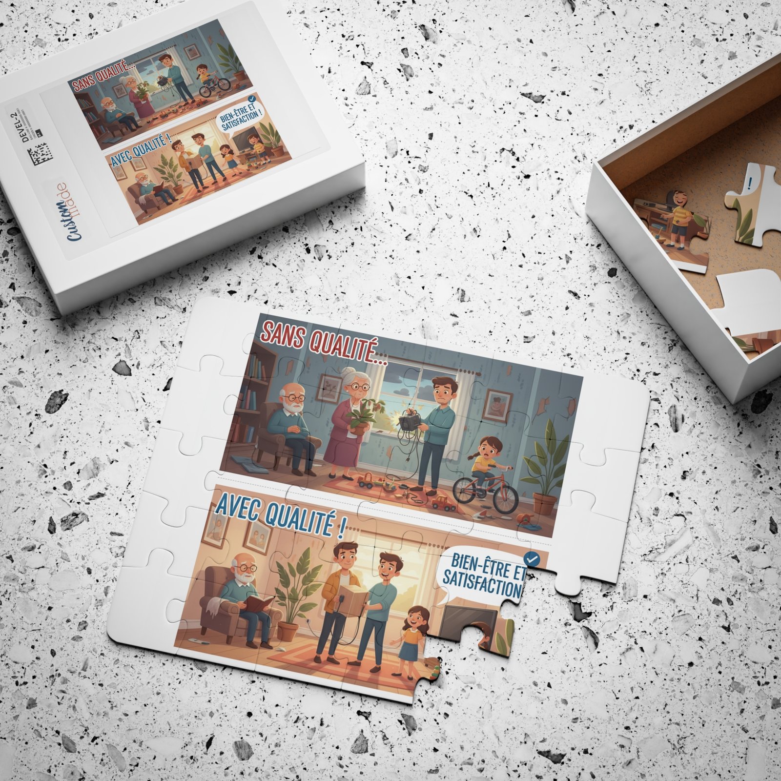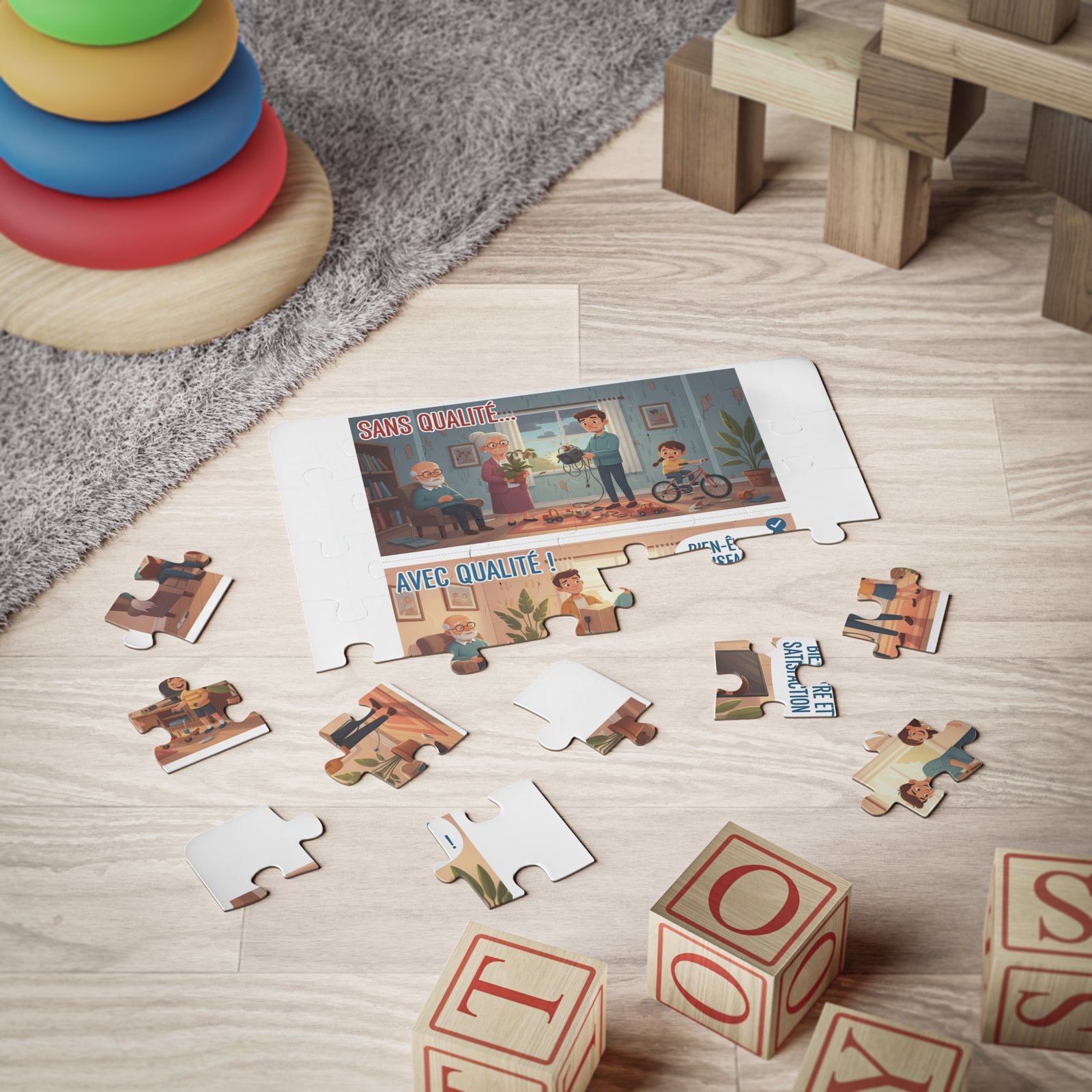 30-Piece Kids Puzzle — “Sans Qualité / Avec Qualité” Family Well-Being Illustration